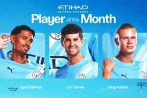 曼城官方8月队内最佳候选:哈兰德、赖因德斯、斯通斯